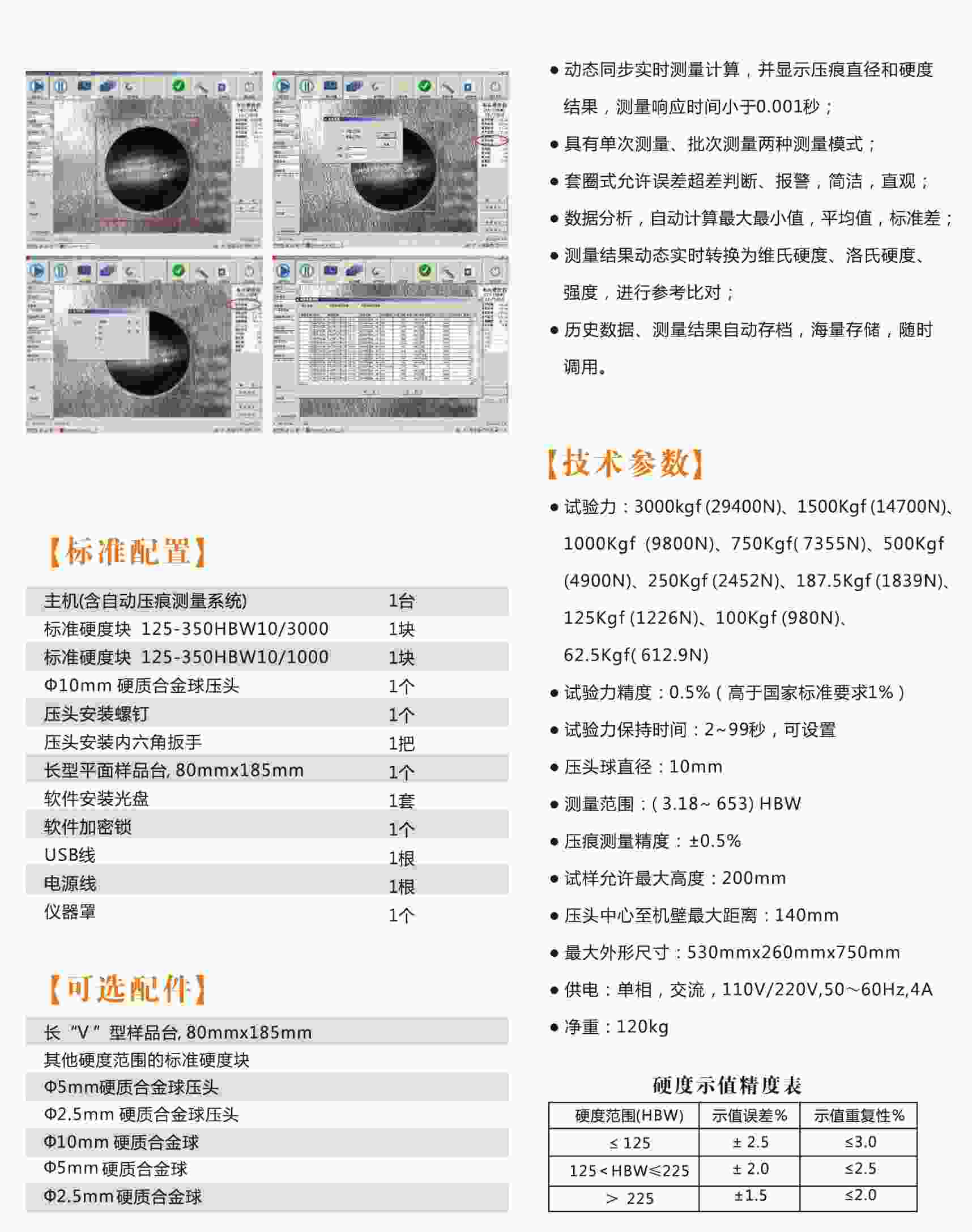 ● 隨機提供布氏硬度測量材料、硬度、參數選擇常識查詢軟件,根據材料種類、硬度范圍選擇0.102F/D2比參數,使操作者準確地執行布氏機測量標準。