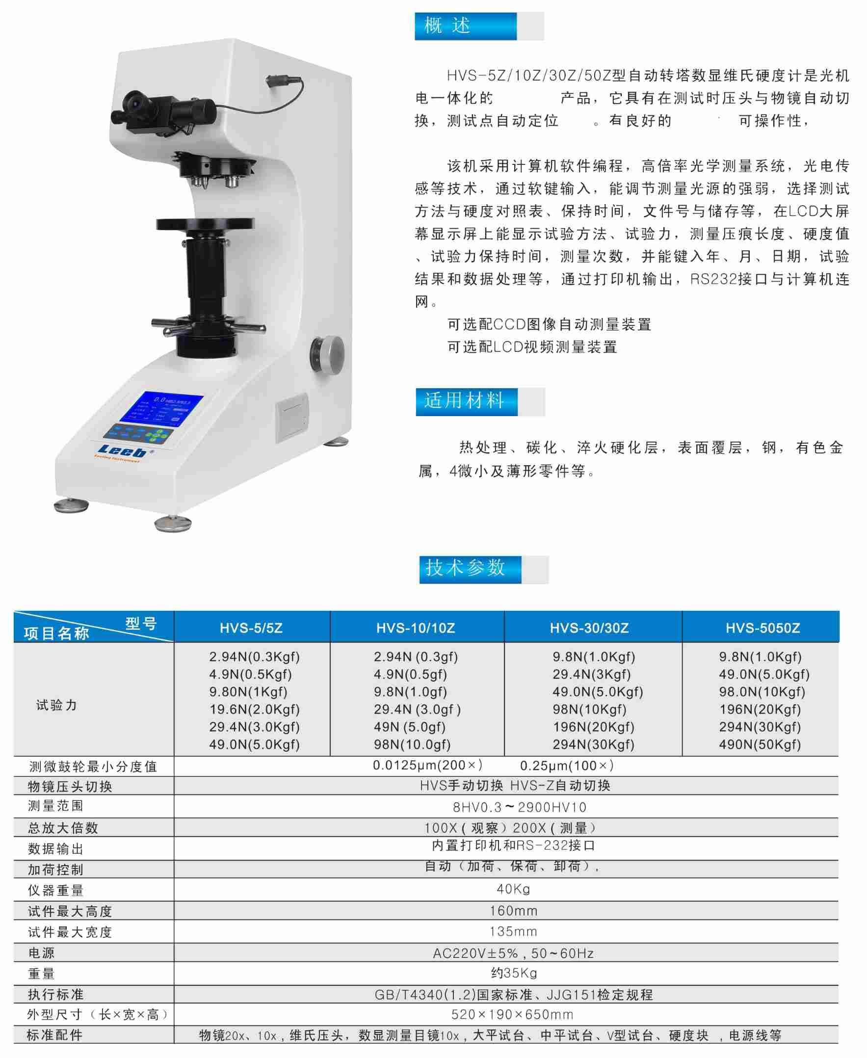 HVS-5Z/10Z/30Z/50Z型自動轉塔數顯維氏硬度計是光機電一體化的產品,它具有在測試時壓頭與物鏡自動切換,測試點自動定位準確,有良好的可操作性。