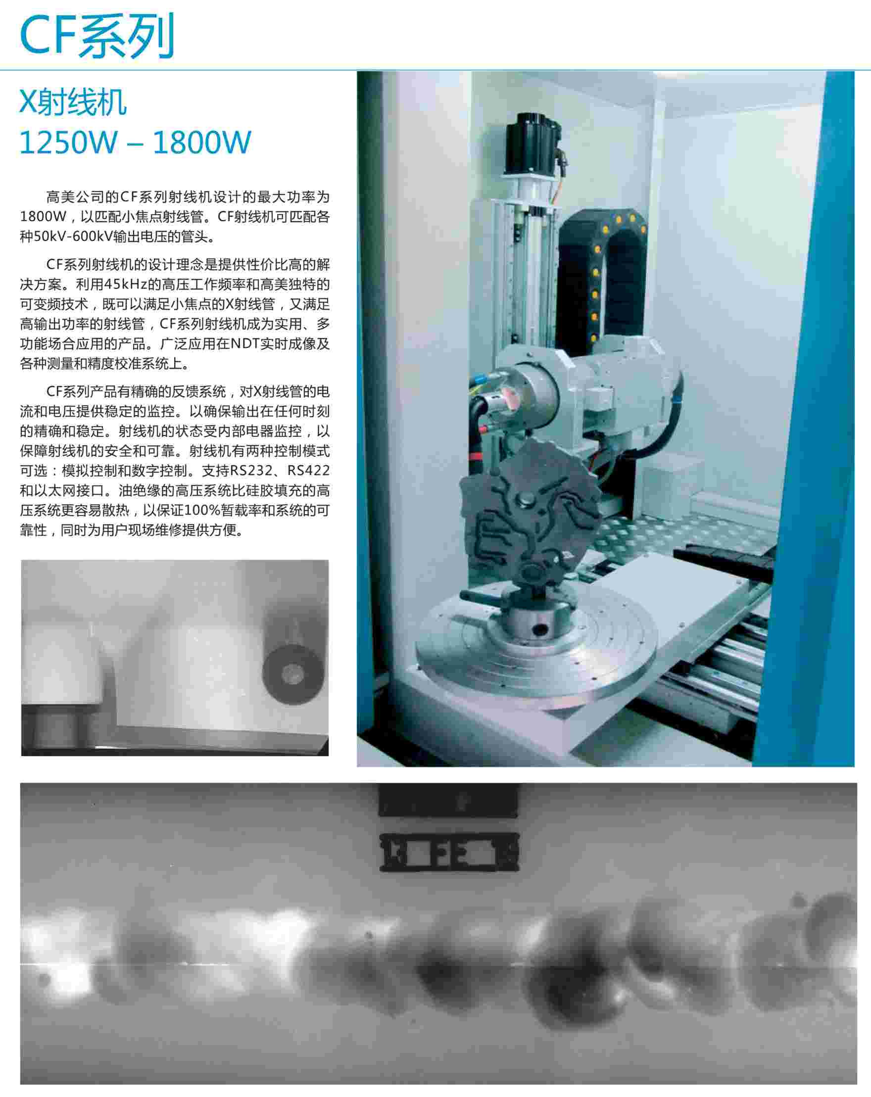 CF系列射線機(jī)的設(shè)計(jì)理念是提供性價(jià)比高的解決方案。利用45kHz的高壓工作頻率和高美特有的可變頻技術(shù),既可以滿足小焦點(diǎn)的X射線管,又滿足高輸出功率的射線管,CF系列射線機(jī)成為實(shí)用、多功能場(chǎng)合應(yīng)用的產(chǎn)品。廣泛應(yīng)用在NDT實(shí)時(shí)成像及各種測(cè)量和精度校準(zhǔn)系統(tǒng)上。