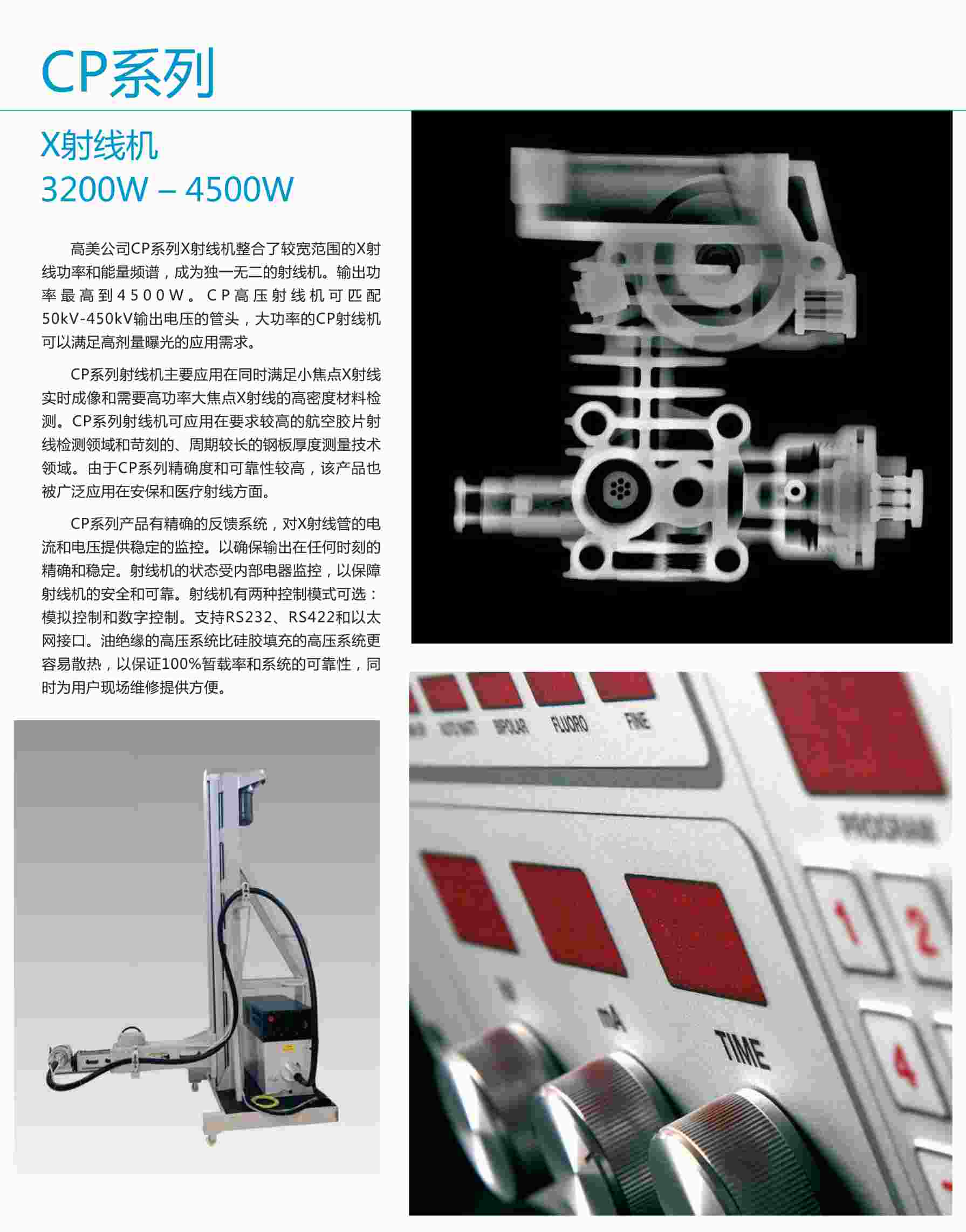 高美公司的CP系列射線機整合了較寬范圍的X射線功率和能量頻譜,成為特有的射線機。輸出功率最高到4500W。CP高壓射線機可匹配50kv-450kv輸出電壓的管頭,大功率的CP射線機可以滿足高劑量曝光的應用需求。