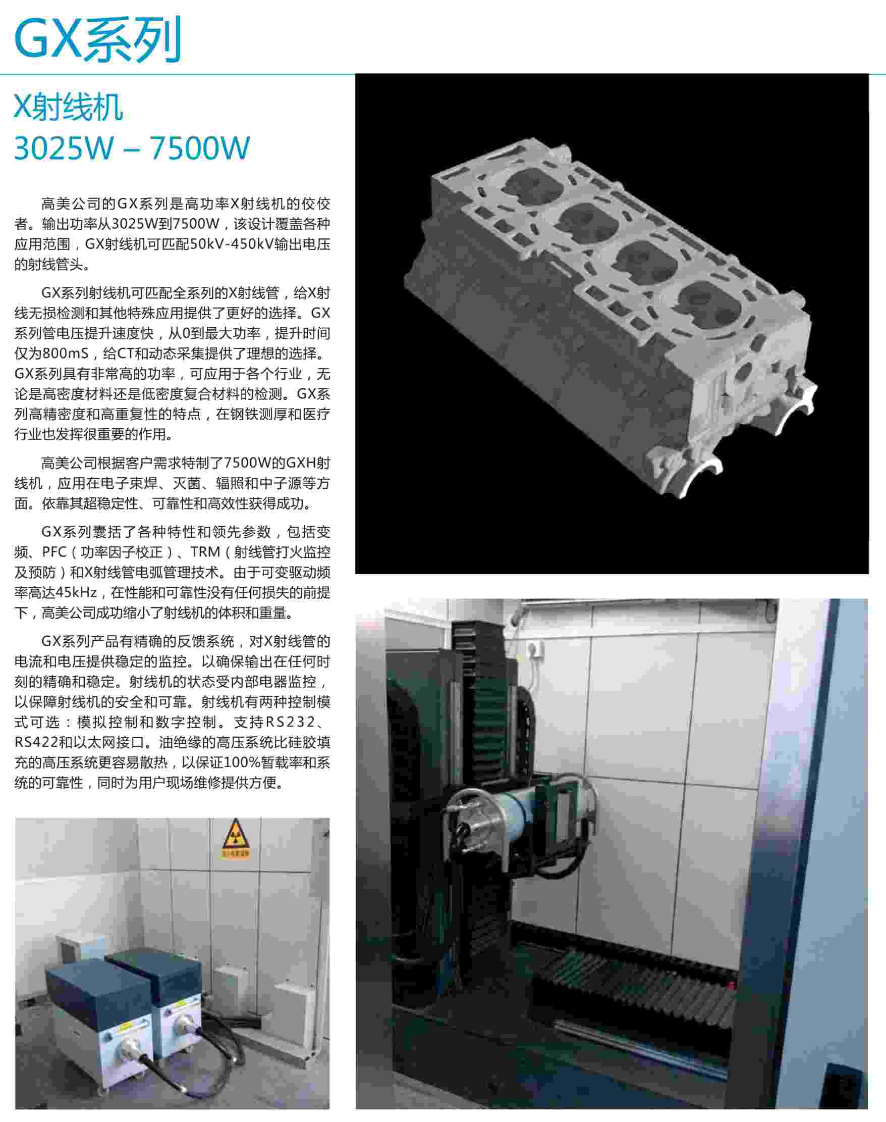 高美公司的GX系列是高功率X射線機的佼佼者。輸出功率從3025W到7500W,該設計覆蓋各種應用范圍,GX射線機可匹配50kv-450kv輸出電壓的射線管頭。