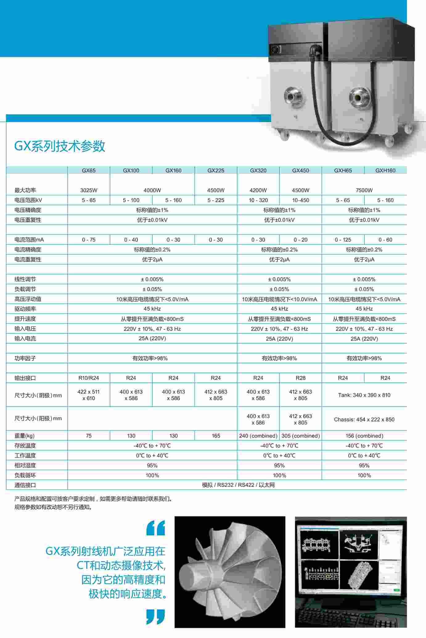 GX系列射線機可匹配全系列的X射線管,給X射線無損檢測和其他特殊應用提供了更好的選擇。GX系列管電壓提升速度快,從0到最大功率,提升時間僅為800ms,給CT和動態采集提供了理想的選擇。GX系列具有非常高的功率,可應用于各個行業,無論是高密度材料還是低密度復合材料的檢測。GX系列高密度和高重復性的特點,在鋼鐵測厚和醫療行業也發揮很重要的作用。