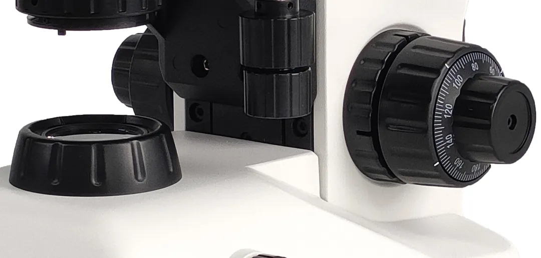 低手位粗微同軸調焦機構,微調精度0.002mm,帶有防止下滑的調節松緊裝置和機械上限位裝置。